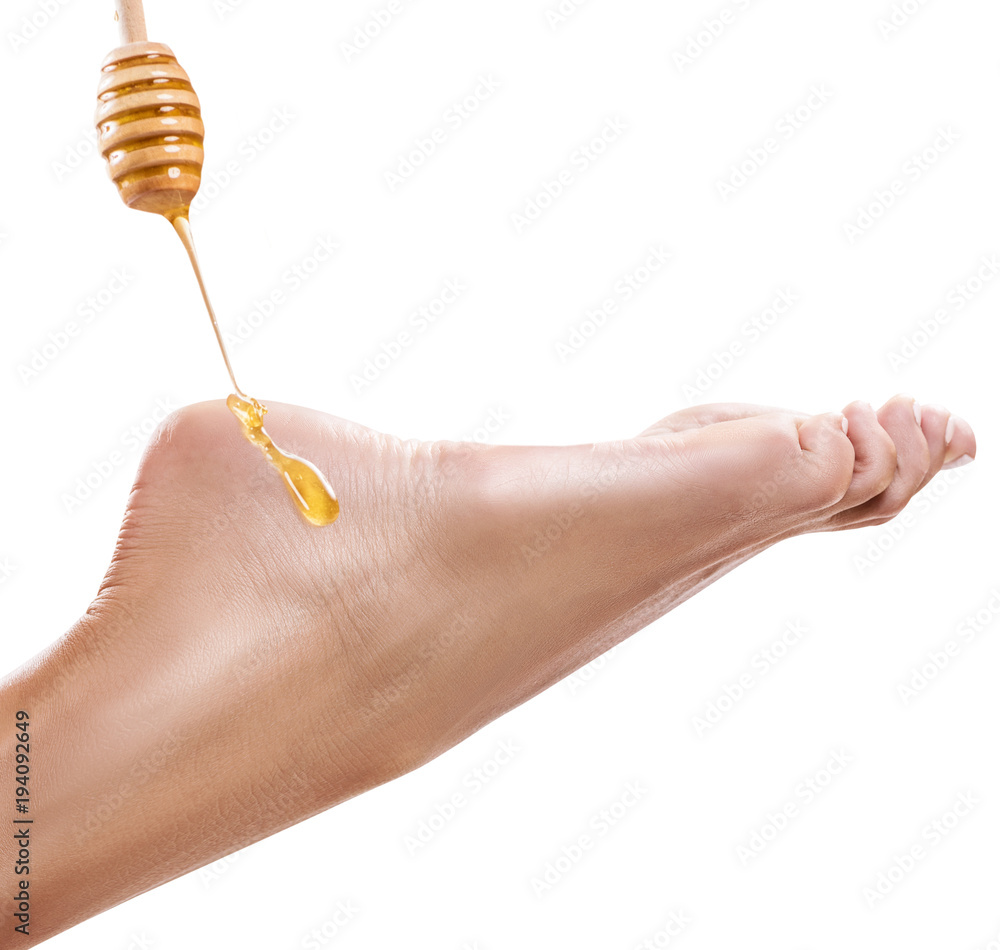 Honey flows down on female foot.