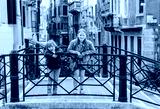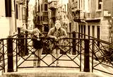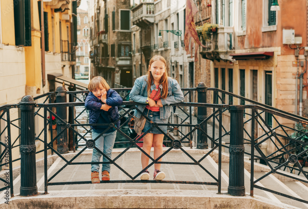 Two kids playing on the bridge in Venice. Little girl and boy visiting Venice, Italy. Small tourists in Europe
