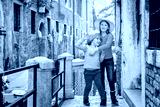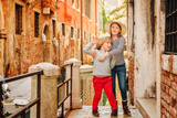 Two kids playing on the bridge in Venice. Little girl and boy visiting Venice, Italy. Small tourists in Europe