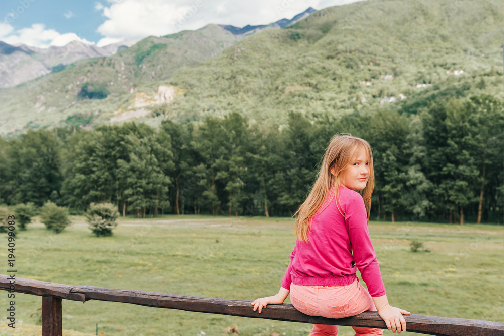 Pretty kid girl resting in mountains, sitting on the fence, looking back ovet the shoulder, wearing pink clothes.