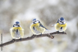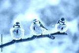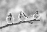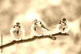 three eurasian blue tits (Cyanistes caeruleus) sitting together on a branch in the wind, the small passerine bird is also called chickadee or titmouse, copy space
