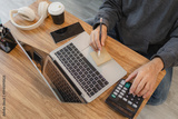 Man calculating expenses while working on laptop at home desk with calculator and smartphone, representing personal finance management, budgeting and remote work lifestyle.