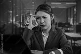 Concerned businesswoman at office desk using laptop, stressed and thinking, modern workplace with blue lighting and glass walls.