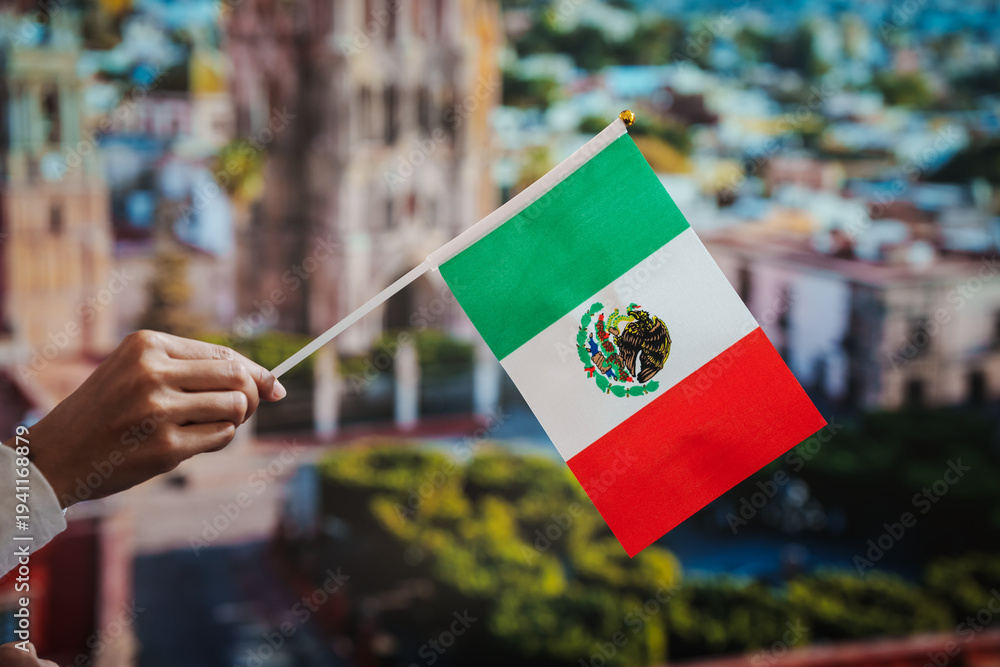 Hand holding small mexico flag on stick with blurred cityscape and cathedral in background, travel and national pride concept.