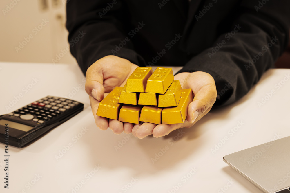 Businessperson holding stacked gold bars over office desk with calculator and laptop, wealth and investment concept.