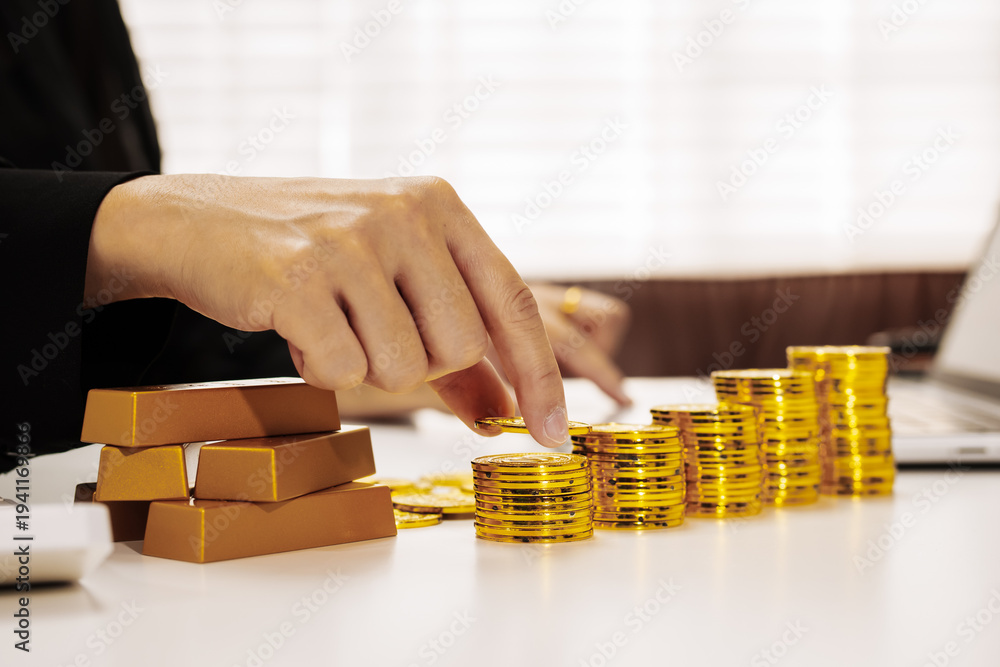 Close-up of businessperson stacking gold coins beside gold bars on desk with laptop in background, illustrating wealth growth, savings, investment and financial planning.