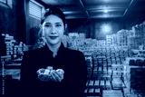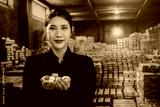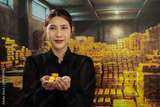 Smiling woman holding small gold bars in hands inside a vault, surrounded by stacked gold bullion under warm lighting, concept of wealth, investment, security.