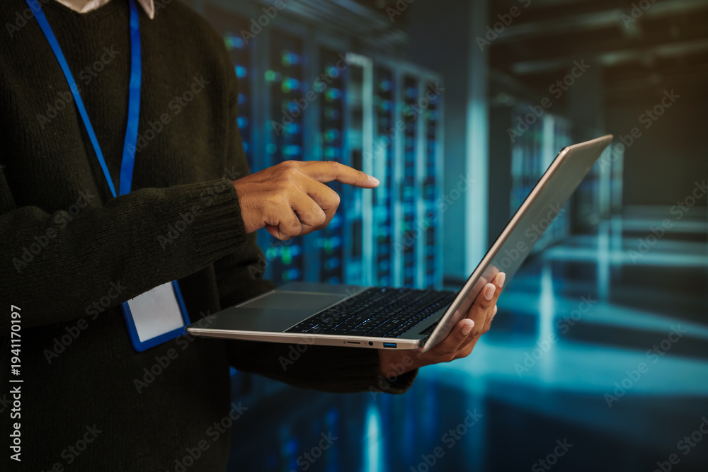Close-up of IT professional using laptop in a data center aisle with glowing server racks, concept of cybersecurity, network administration, cloud computing and technical support.