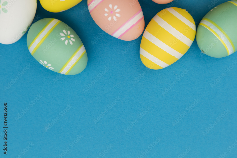 Easter holiday background. Pastel colored decorated easter eggs on a bright blue background