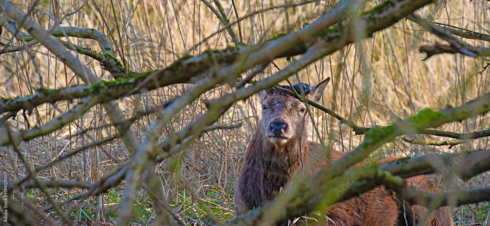 Red deer in a forest in sunlight in winter, Almere, Flevoland, The Netherlands, March 8, 2026