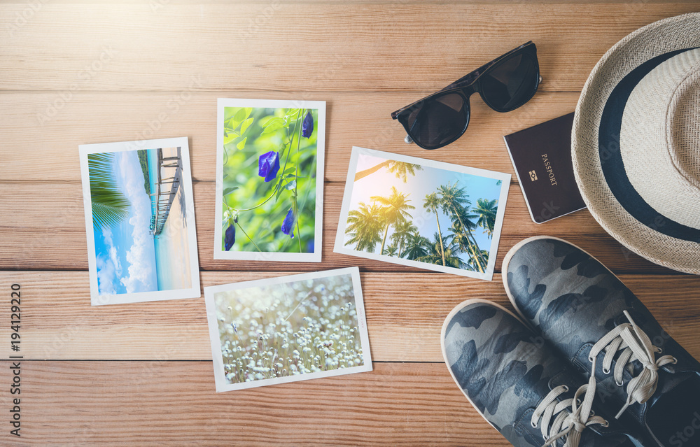 Top view photo album on wood.