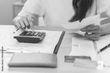 Deduction planning, debt asian young woman calculating money balance of finance from bill and income, cost budget expenses for pay money form personal individual on table at home. Financial concept.