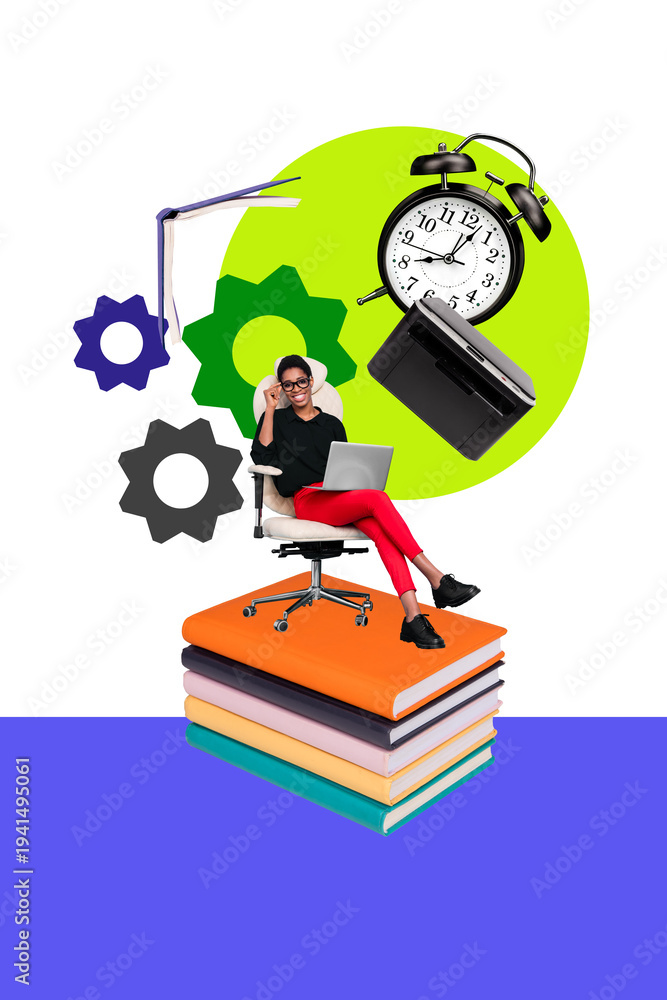 Template collage artwork 3D sketch of human resources recruitment worker office job young lady sit armchair pile book clock printer office