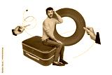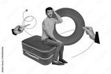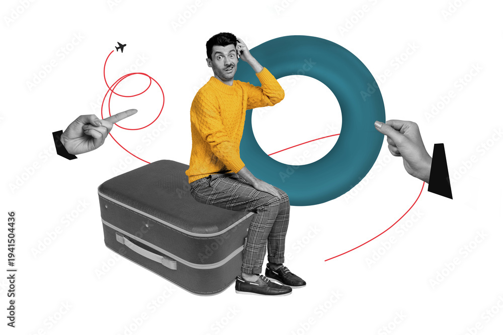 Composite photo collage of doubtful man sit suitcase hand point airplane leaving vacation summer flight isolated on painted background