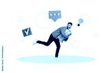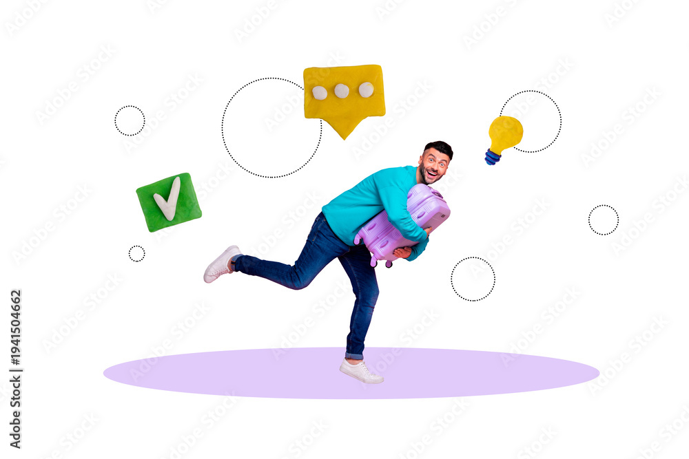 Composite photo collage of excited energetic guy run suitcase light bulb plan checkmark approval bubble isolated on painted background