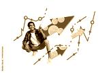 Collage picture young cheerful man finger showing nft virtual currency bitcoin golden tokens economy growth improvement development