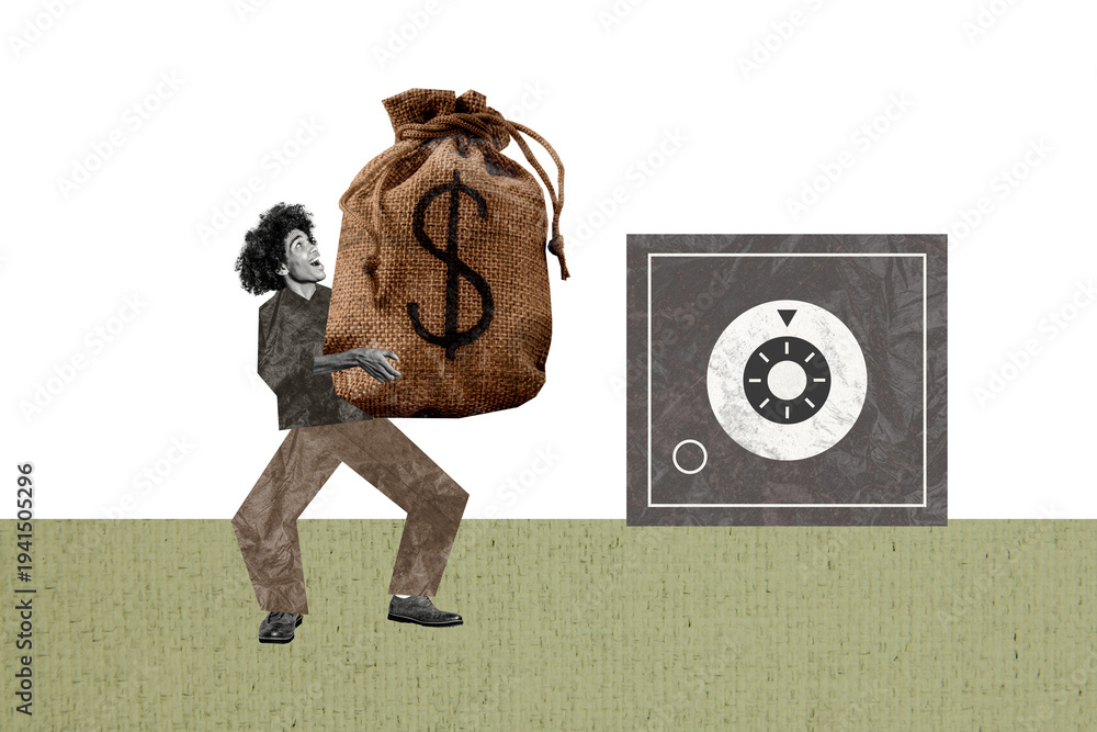 Creative collage picture young man carry huge money sag bag put safe store security protection collect savings drawing background