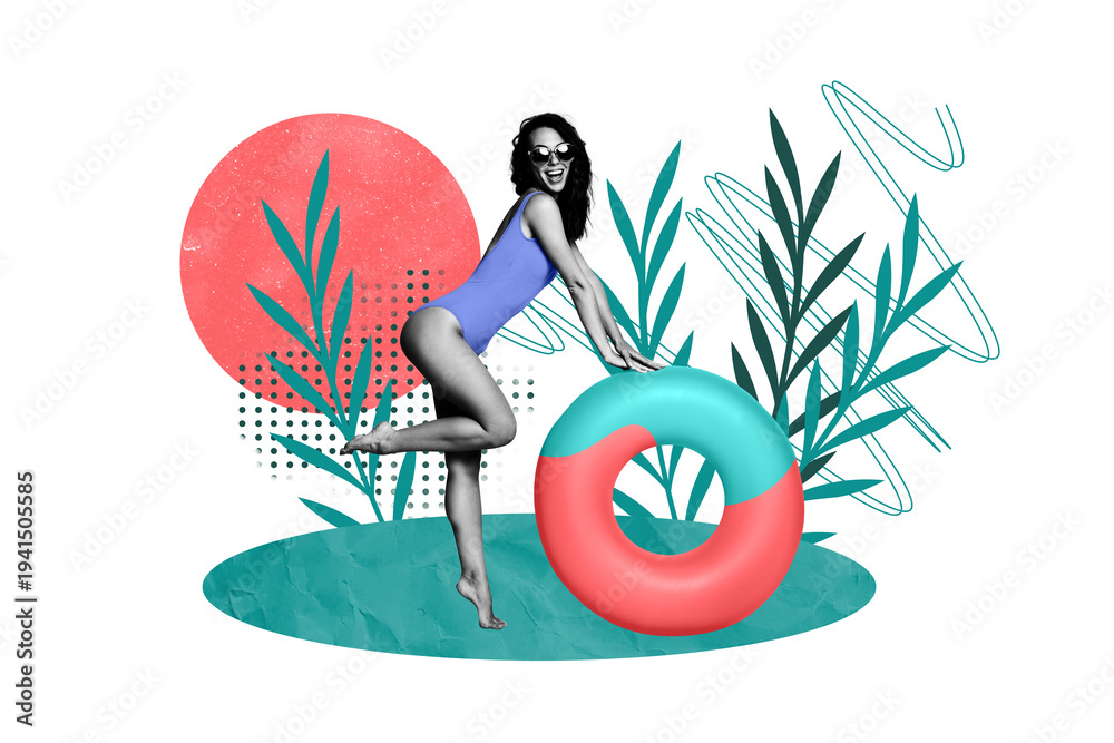 Creative collage picture image young attractive fit cheerful girl bikini flora resort vacation environment drawing background