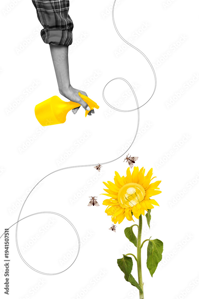Trend artwork composite sketch image photo collage of surreal space spring season nature flower sunflower insect fly hand watering spray