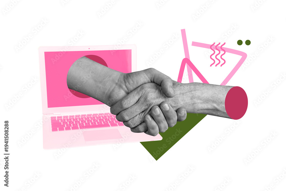 Composite photo collage of hands hold together distant love correspondence macbook device cooperation isolated on painted background
