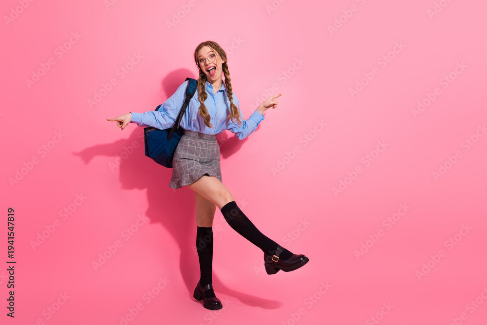 Cheerful young student with backpack poses in plaid skirt on pink background exuding happiness and vibrant youthful energy