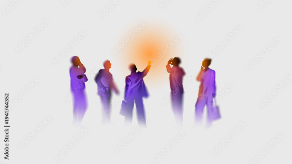 Business silhouettes pointing upward in colorful blur light effect representing leadership vision and strategy. Ideal for corporate presentations, startup marketing and business growth advertising.