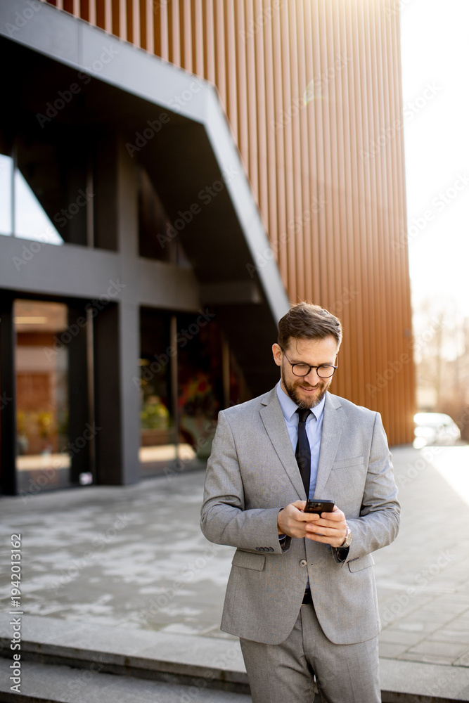 Businessman checks phone outside modern office building during daytime hours