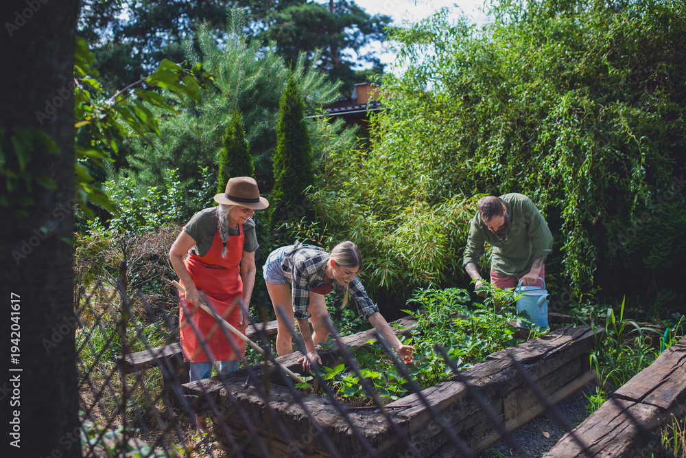 Happy young and old farmers working with garden tools outdoors at community garden.