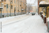 Heavy snowfall in the city. Streets, houses and machine Snowy.