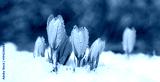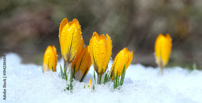 Flowers grow under snow on a spring sunny day. Crocuses yellow are the first flowers for Easter.