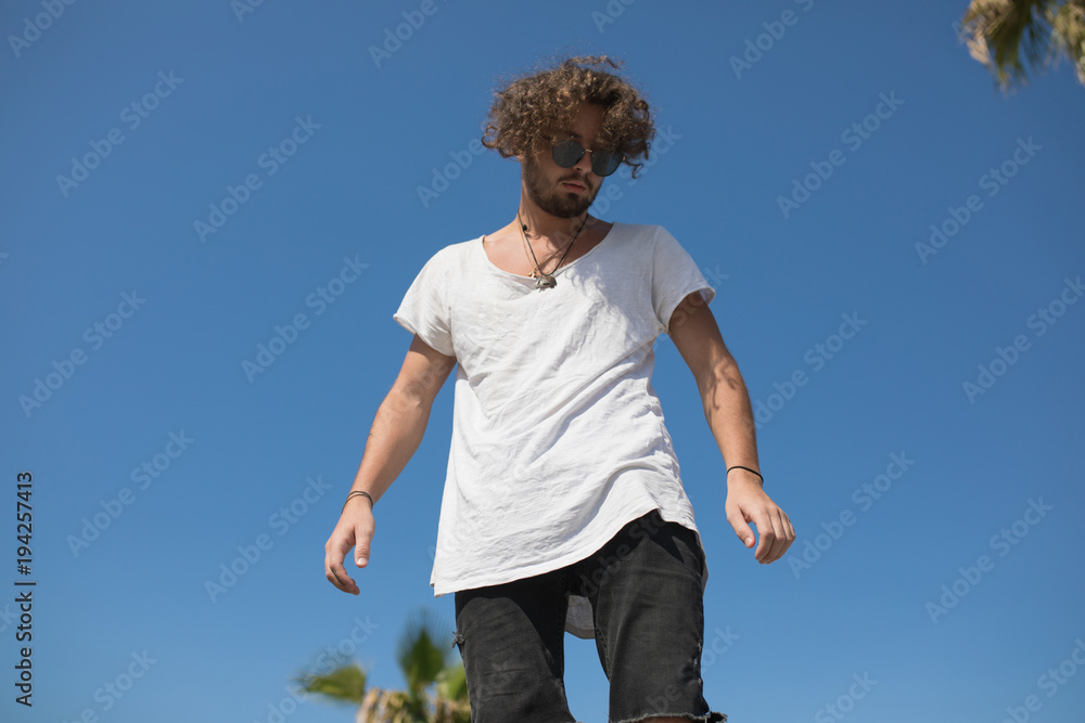 Attractive man in a white t-shirt on a blue sky background. Mock up.