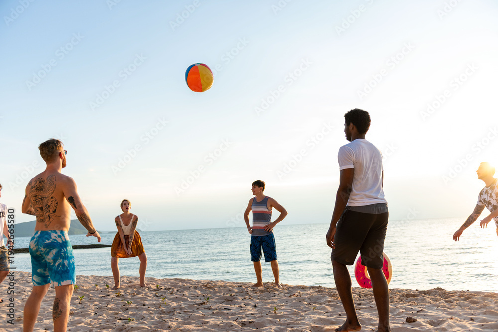 Friends playing beach volleyball sunset.