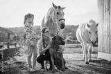 Portrait of woman and her daughter with dog and horses on family ranch at sunset. Rural lifestyle with pets and animals. Happy moment together
