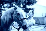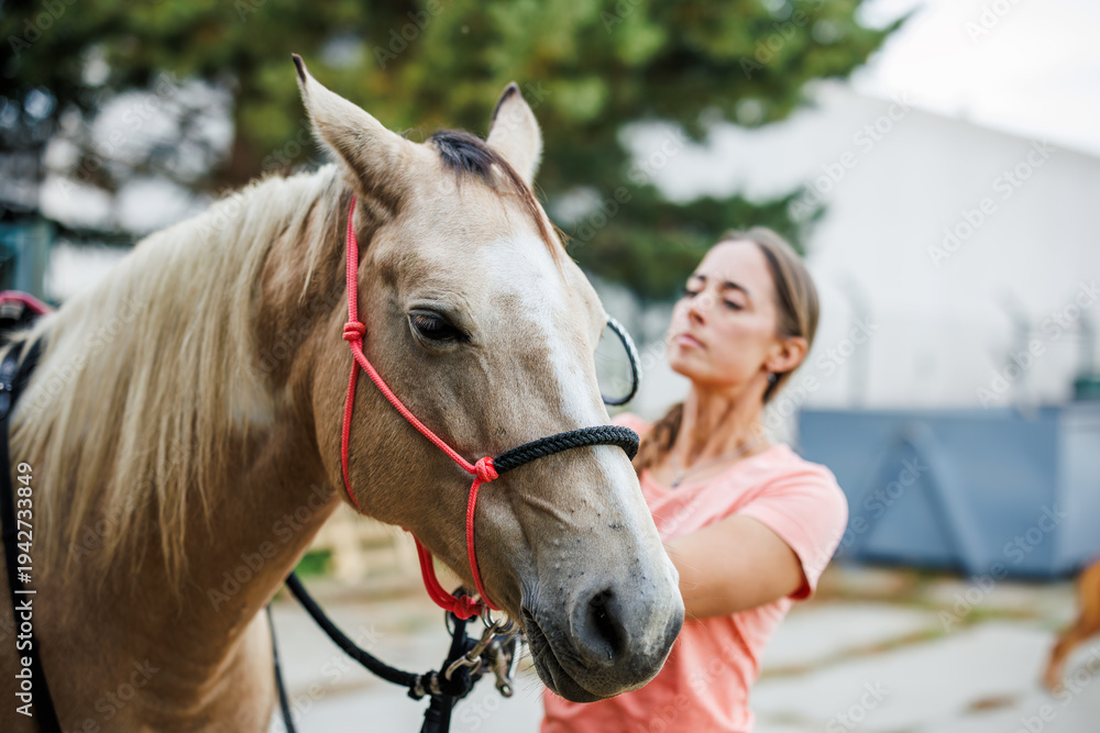Woman putting animal halter and saddle on horse in ranch. Equestrian preparation for horse riding session