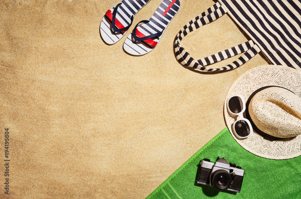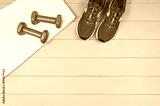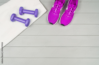 Sport and fitness accessories, healthy and active lifestyle concept on wooden floor background with copy space. Products with vibrant, punchy pastel colours. Image taken from above, top view.