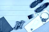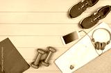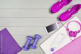 Sport and fitness accessories, healthy and active lifestyle concept on wooden floor background with copy space. Products with vibrant, punchy pastel colours. Image taken from above, top view.
