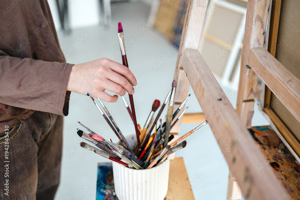 Close-up of a painter's hand holding a paintbrush in her studio