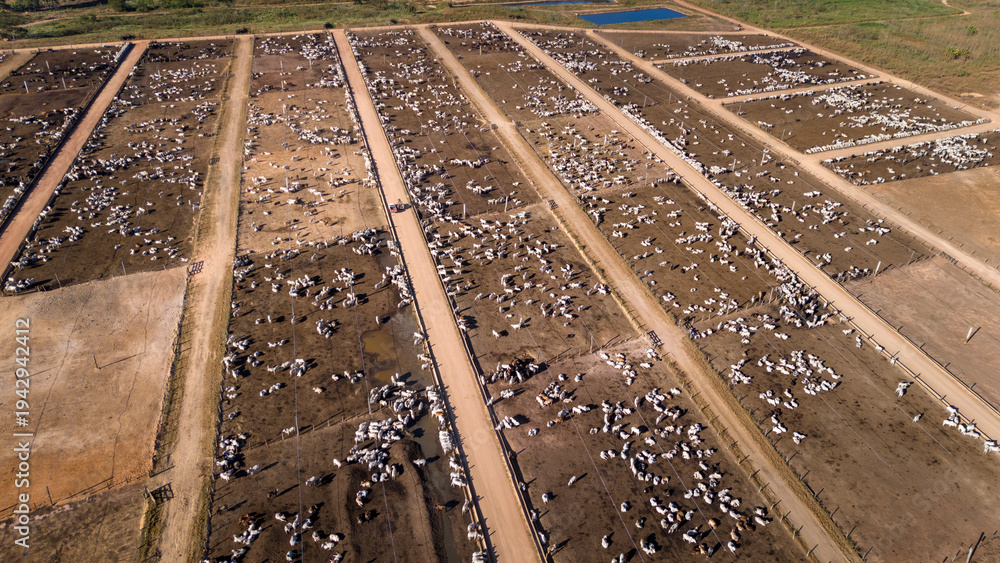 Aerial drone view of farm feedlot cattle grazing for meat production in Amazon region, Para, Brazil. Concept of agriculture, environment, ecology, economy, exportation and beef industry.