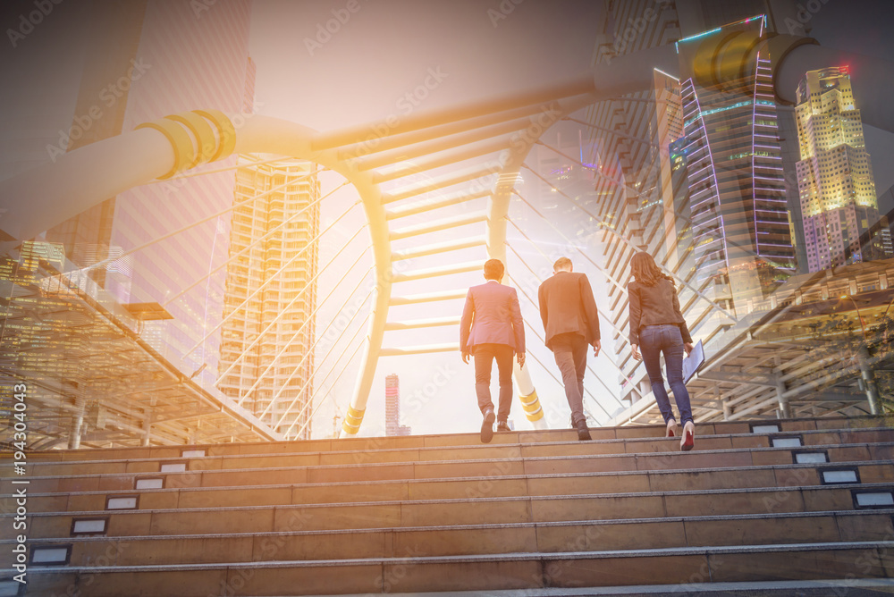 Double exposure image of Rear view of business team climbing stairs go to a city. Business concept