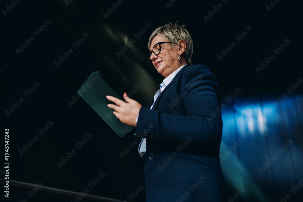 Senior businesswoman smiling while using stylus on tablet, representing joy, confidence, and professional engagement with mobile digital tools in modern work culture.