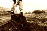 Gardener is digging soil with a shovel at spring green outdoors background.