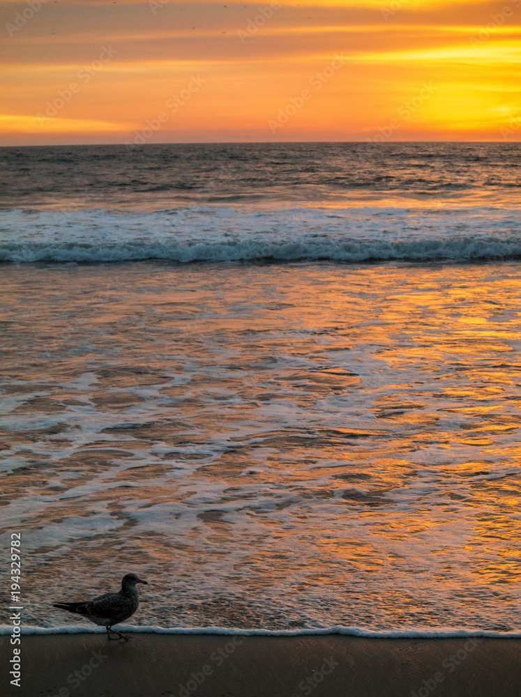 lonely bird walking the beach at sunset