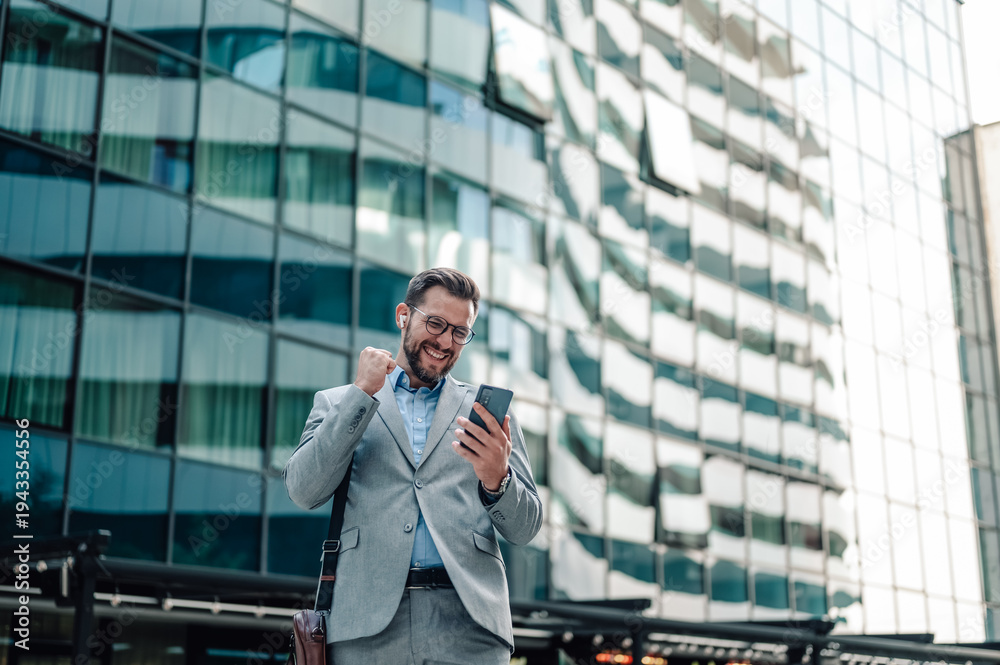 Happy businessman celebrating success checking phone notification