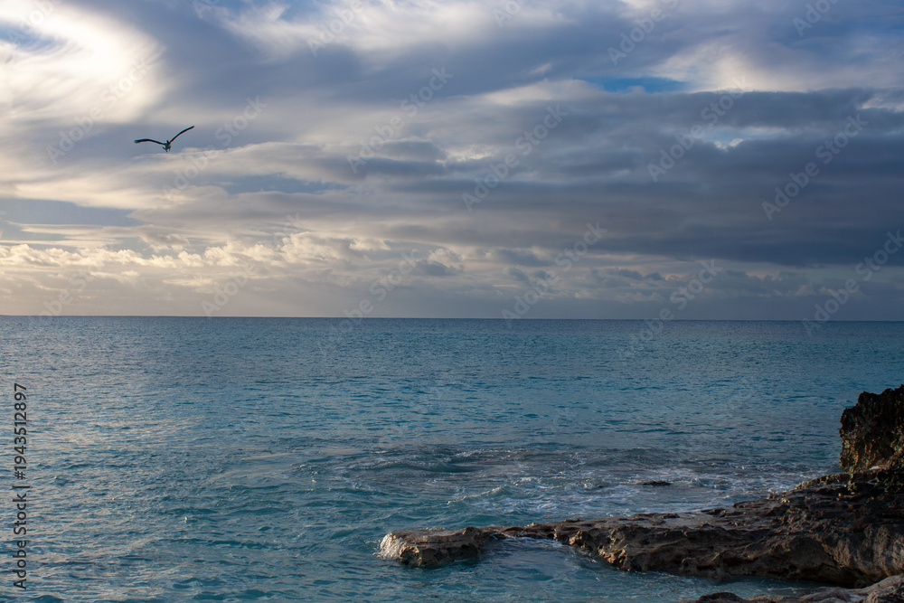 Bird soaring over the turquoise ocean at sunset, with dramatic clouds and a rocky coastline in the tranquil Caribbean, symbolizing freedom and travel