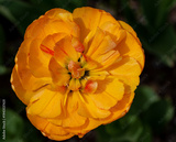 A flower garden bed of vibrant yellow tulips with red stripes. There's a bud in the foreground that hasn't bloomed. The flower in the center is in full bloom. The ground covering is tall green grass.