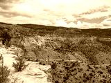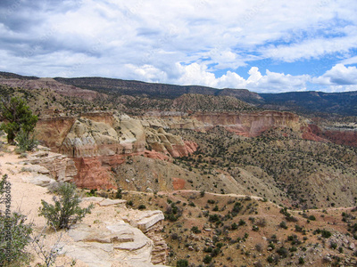 Cliffs, canyons and desert landscape at Ghost Ranch, New Mexico seen from Chimney Rock trail under a cloudy western sky