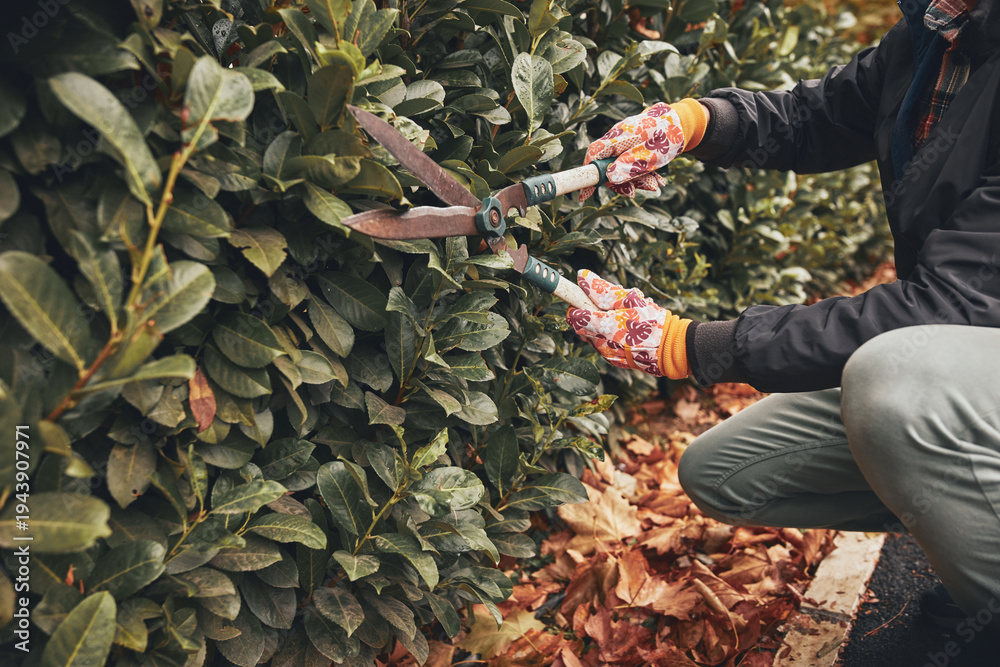 Gardener using pruning shears, taking care of hedge and plants.