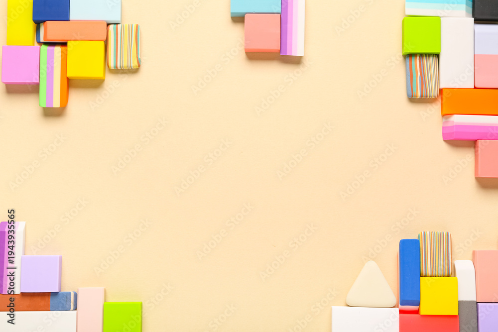 Frame made of different rubber erasers on beige background