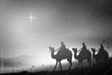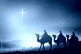 Christmas religious nativity concept: Prophecy magi and his friend with three camel on desert was going to bethlehem city in christmas eve.