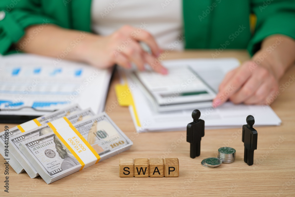 A professional setting showcases a transaction between two figures. Bundles of cash sit next to coins, symbolizing a dynamic exchange. Charts and reports add to the business atmosphere.